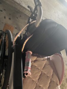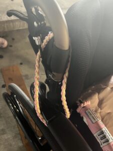 車椅子に使用する時は短い紐を介助バーにひっかけて落ちないようにセットします!