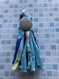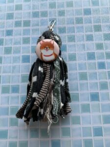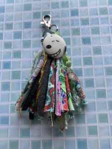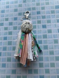 Tシャツヤーンや紐を組み合わせて、クルミボタンで飾り付けしています。
